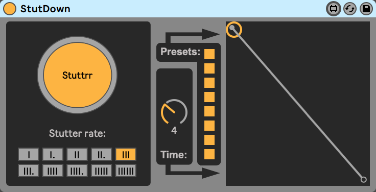 Usage: drop StutDown onto any MIDI or audio Ableton Live track, make some sound and press Stuttrr button to start granular pitch-down or build-up. If the envelope goes from 0 to 1, the pitch will go up. If the envelope goes from 1 to 0 the pitch will go down. An envelope set to a horizontal line will produce a static pitch. Click the envelope window to create new points, shift-click to remove available points. Use Time dial change the envelope duration (from 1 to 10 seconds). The stutter rate buttons allows you to change the speed of the looping of the sound: the more vertical stripes - the faster is the granular effect. You can save up to 8 combinations of Stutter rate, Time Dial and Envelope in the Presets section. Shift-click the slot to save a preset, click to restore the preset.